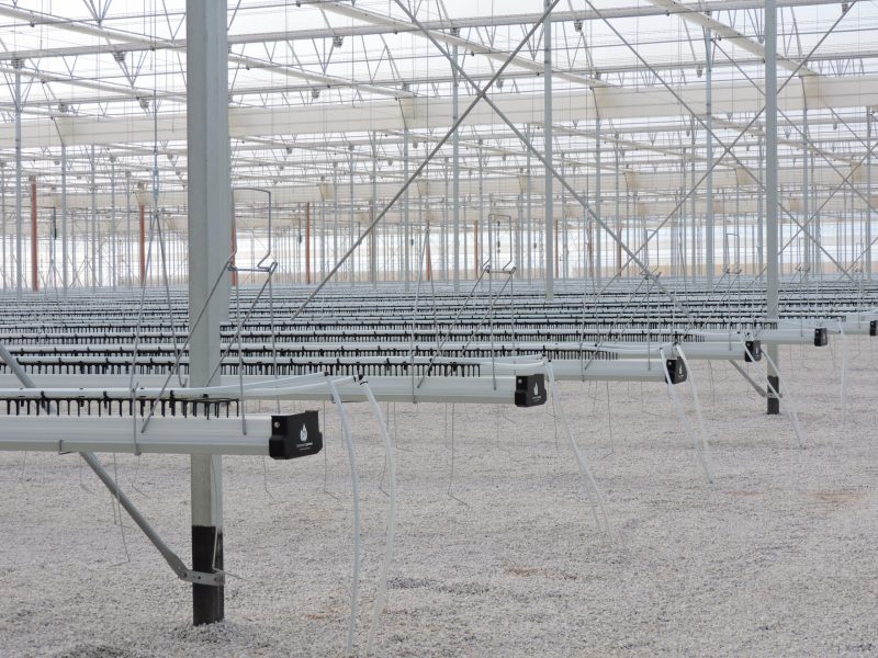 L’une des caractéristiques clés de la serre, mise en avant par les techniciens de l’entreprise, est l’utilisation de systèmes de culture hydroponique avec des canaux métalliques suspendus à la structure. Ce système, qui comprend une entretoise, offre aux sacs de culture une zone d’aération supplémentaire à leur base, permettant aux racines de se développer et d’être nourries uniformément, tout en évitant le contact avec des surfaces susceptibles de provoquer stress ou maladies.