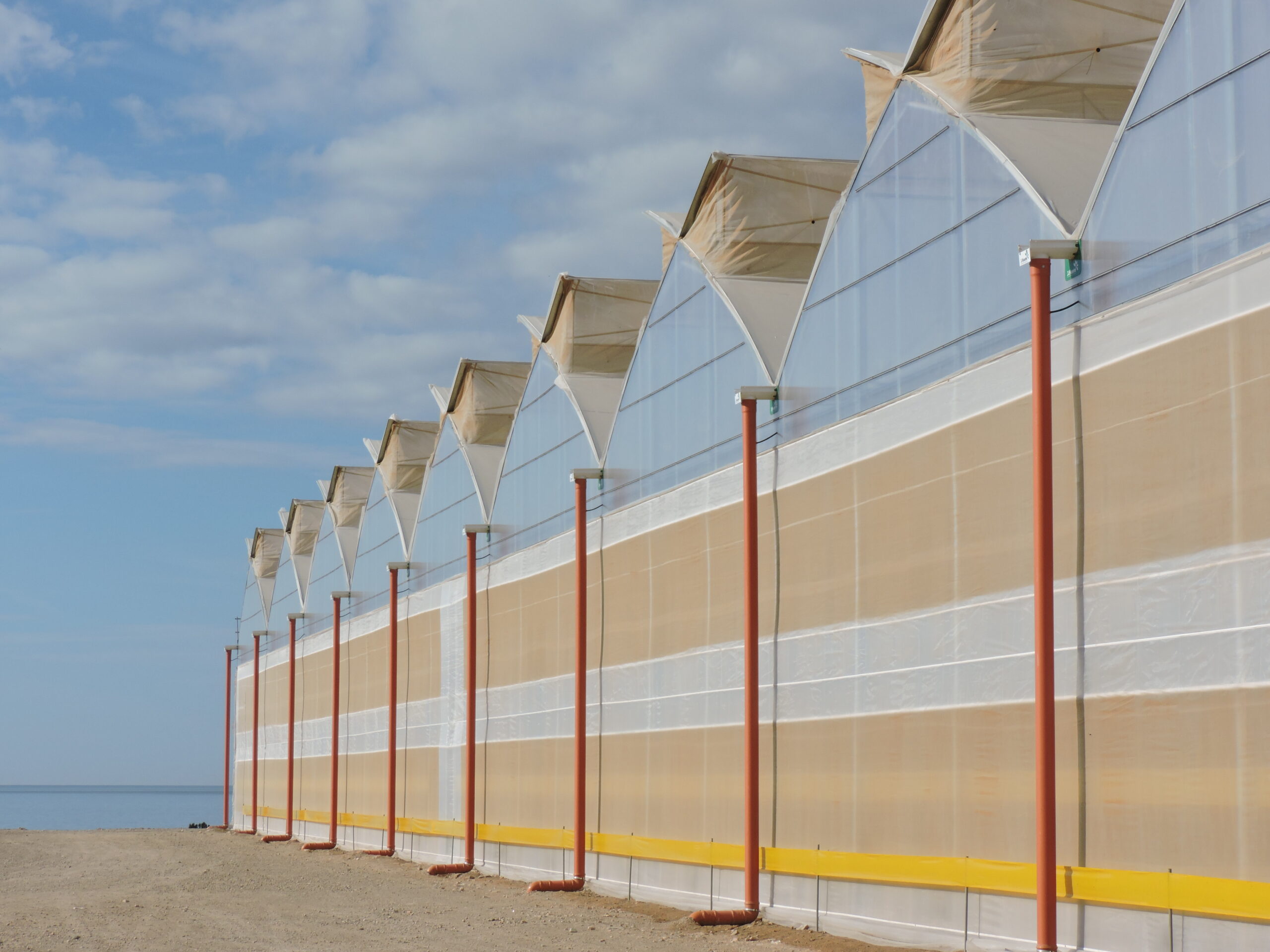 La conception du projet repose sur une structure de grand volume, d’une hauteur de six mètres jusqu’à la gouttière et de 8,80 mètres jusqu’au faîte. Ces dimensions permettent un contrôle plus stable du microclimat, réduisant les variations de température et améliorant la circulation de l’air, même pendant les mois les plus exigeants. L’installation intègre une ventilation de toiture de type papillon, une ventilation périphérique, une bâche plastique de pointe traitée anti-UV, des écrans thermiques à économie d’énergie, des systèmes de climatisation, des capteurs avancés et un système électrique complet conçu pour garantir une précision opérationnelle maximale.